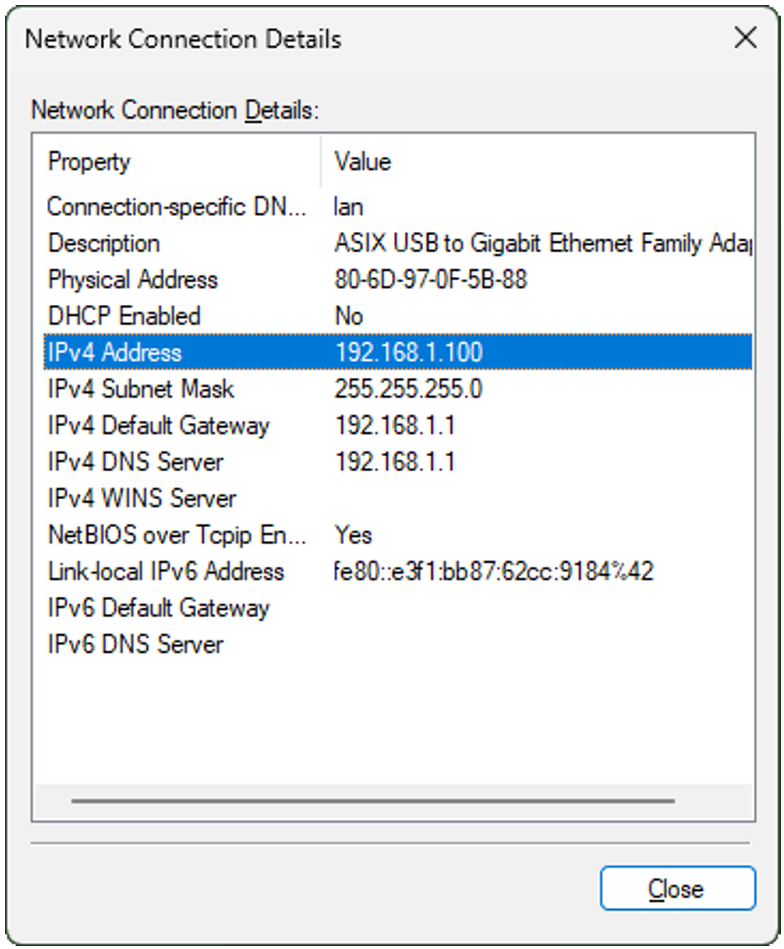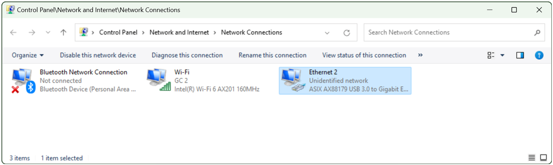 - In the Network Connections window, double-click the Ethernet connection to open the connection status window.