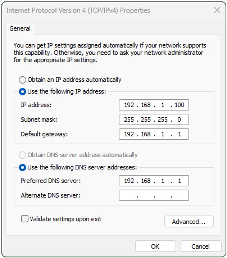 In the Internet protocol properties window, enter the settings and click OK (replace the addresses with the ones that are relevant for your configuration, e.g. 10.1.10.100 if you need to connect to the main WWVDS unit, or 192.168.1.100 if you need to connect to the cameras).
