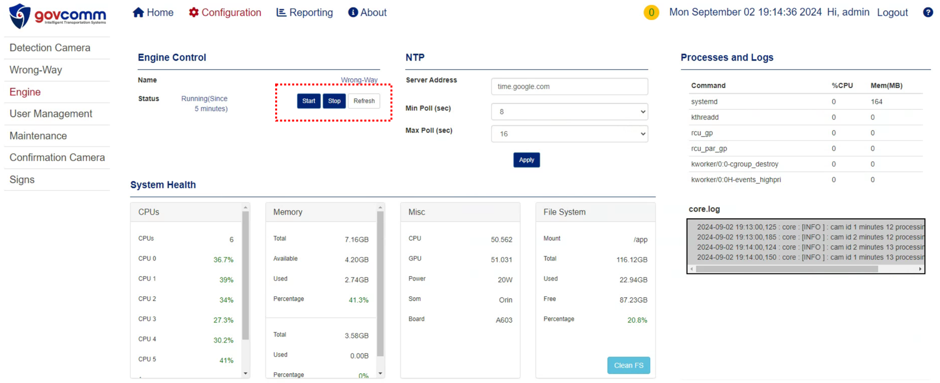 - In the Engine Control pane, click Stop to halt the engine, then click Refresh to verify its stopped status.