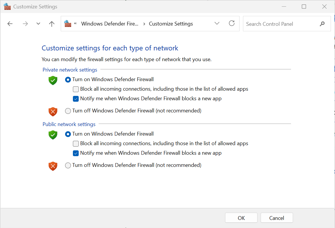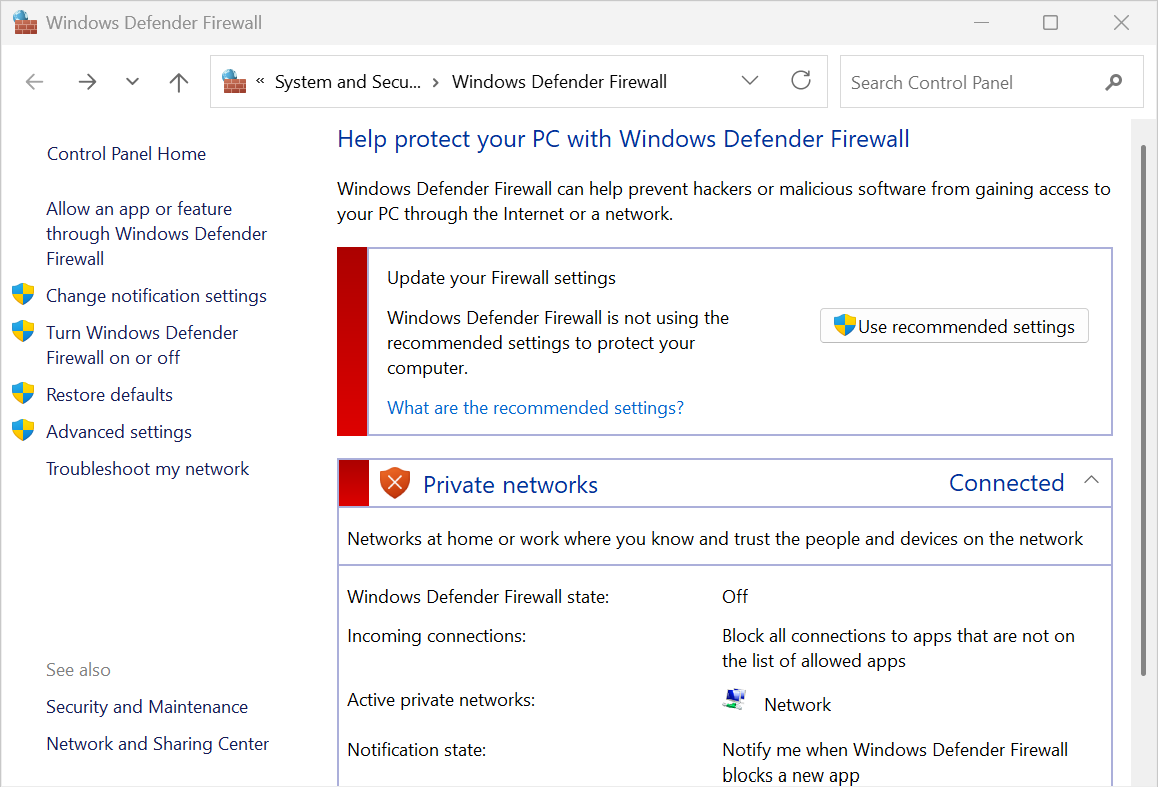 - Select Turn Windows Defender Firewall on or off on the left and configure the firewall settings as shown below (turn the firewall on).